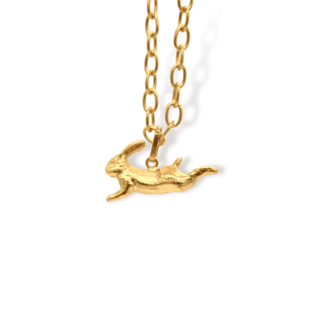 Esta cadena es hecha a mano en bronce y oro de 24 kilates. La liebre saltando simboliza agilidad, pero también una belleza natural que cautiva a todo el mundo. Es delicada y elegante pero a la vez sencilla, lo que la hace perfecta para llevar a diario o para añadir un significado especial a tu look en cualquier ocasión.