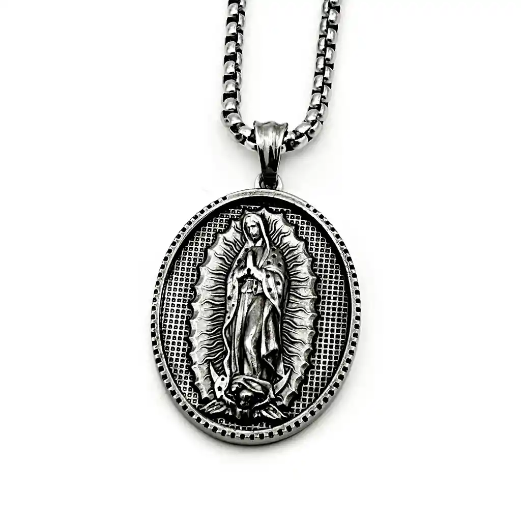 Hermosa cadena con medalla de la Virgen de Guadalupe, elaborada completamente en acero inoxidable de alta calidad. Es mucho más que un accesorio, es un símbolo de devoción y protección que se lleva cerca del corazón todos los días. Presentada en cajita de regalo, lista para sorprender en cualquier ocasión. Medalla de la Virgen de Guadalupe: La Virgen de Guadalupe es uno de los símbolos más poderosos de fe, amor y protección. Portar su imagen es un acto de devoción que trasciende generaciones. Representa la intercesión divina, la esperanza en los momentos difíciles y el amor maternal incondicional. Quienes la llevan consigo sienten su guía y protección en cada paso del camino. Especificaciones: - Grosor de la cadena: 3mm - Largo de la cadena: 60cm - Medalla: Ovalada · 26mm x 32mm - Material: Acero inoxidable Resistente al agua, al sudor y a las lociones. Su brillo y color se mantienen intactos con el uso diario, garantizando una pieza duradera que acompañará a quien la lleve por muchos años.