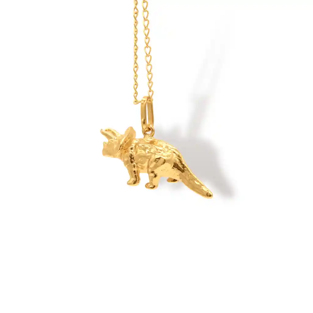 La cadena con el dinosaurio triceratops es una oda al ya extinto. El triceratops es conocido por su distintiva cabeza con tres cuernos y una gran cresta ósea que se extendía desde la parte posterior del cráneo. Esta cadena va a ser elogiada por todos gracias a su distintivo dije, así que podrás lucirlo para un evento especial.