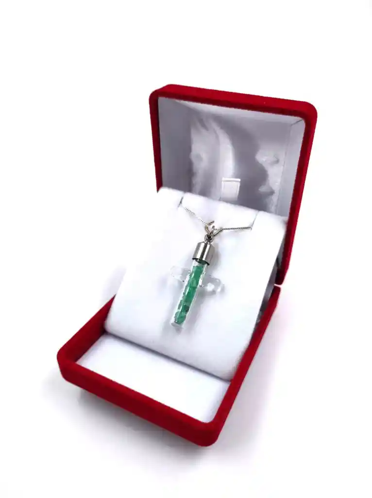 Hermosa cadena de plata con dije de cristal en forma de cruz lleno de esmeralda en bruto de las minas de Muzo en Boyaca El color del estuche puede variar