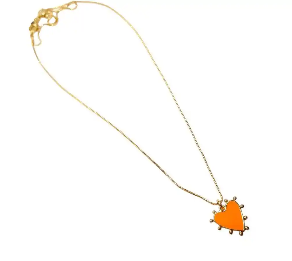 Presentación: Cierre Ajustable Material: Acero Quirúrgico Color: Dorado Diseño: Corazón Naranja Producto Hipoalergénico. Tamaño cadena 60 cm Caracteristicas: Es un material que no se oxida, no se oscurece con el tiempo, su tonalidad y brillo no se alteran. Es Antialérgico, la cantidad de níquel que tiene es residual por lo que en rarisimas ocasiones causa alergias. No necesita mantenimiento. Es un material duro, 1000 veces más duro que el platino y no se deforma.