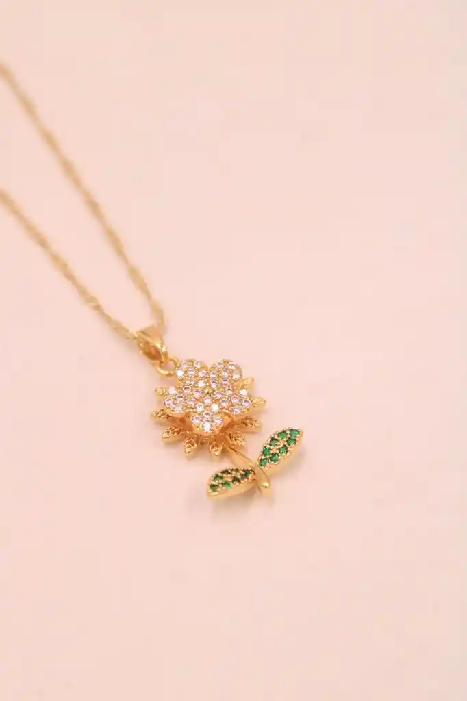 Encantador collar con dije en forma de flor, adornado con delicados brillantes y hojas con detalles verdes que resaltan su diseño natural. Su acabado dorado lo convierte en un accesorio elegante y femenino, ideal para darle un toque fresco y sofisticado a cualquier look. "Garantías Condiciones de GARANTÍAS. Importante tener presente que no aplica garantía por Color o Modelo ya que se envía según disponibilidad y este producto no cuenta con variables. No aplica Garantía por modelo o color en los productos que no cuentan con variable, se envían según disponibilidad, de igual manera no aplica garantía por intensidad de colores publicados en la imagen. No aplica garantía sobre garantía. * OJO en el caso de ser aprobada una garantía no se enviará el cambio hasta no recibir el producto sobre el cual se está aprobando la garantía, una vez recibido en un término de 24 a 48 horas se hace despacho del cambio* Condiciones para montar una Garantía en la plataforma. Toda garantía para ser procesada debe llevar la suficiente información con videos o fotos donde se pueda evidenciar el daño o mal funcionamiento de las mismas. Y debe llevar la guía de entrega con la que llego. (la guía hace las veces de facturación para la reclamación de la orden) Condiciones para la devolución de un producto. * Para hacer efectiva la devolución, el producto debe entregarse debidamente protegido cuidando el estado del empaque original, incluir todos los documentos y/o manuales y accesorios (si aplica). Además, el estado de la guía debe encontrarse en ENTREGADO, para así mismo proceder. Garantías por piezas Faltantes * Piezas faltantes o productos rotos, dañados y con abollonaduras: Para realizar un proceso de garantía, cuentas con máximo 2 días para reportarla a partir de la recepción del producto, a través de la plataforma, en la cual se debe especificar y argumentar la novedad con evidencias (fotos y videos del estado de recibido del producto con su empaque y la foto o video de la guía de recibido) Ley de retracto * Ley 1480 de 2011/ Para ejercer el derecho de retracto, el consumidor debe devolver el producto al proveedor en las mismas condiciones en que lo recibió. Los costos de transporte y otros que conlleve la devolución corren por cuenta del consumidor. El término máximo para ejercer el derecho de retracto será de cinco (5) días hábiles, contados a partir de la entrega del producto. Se anulará automáticamente el derecho a retracto si el producto fue usado. o no viene en las mismas condiciones de entrega, con sus accesorios, sellos de seguridad, manuales y lo que conlleve el mismo. Fallas de fábrica * Para realizar el reporte, cuentas con 30 días de garantía por funcionamiento y/o daños del producto que no estén relacionados con el correcto funcionamiento de este, es importante aportar las evidencias (video) donde el producto no este funcionando y se debe reportar mediante la plataforma. En casos de Cambios o devolución de las garantías. * En los casos que se apruebe una garantía por mal funcionamiento o cambio del producto. Se deberá enviar el producto inicial a nuestras bodegas. Una vez el producto llegue contaremos con 48 horas para el envió del producto por cambio o reparación de este.Si encuentras un mejor precio en el mercado, escríbenos y compártenos el link de este para poderlo evaluar. "