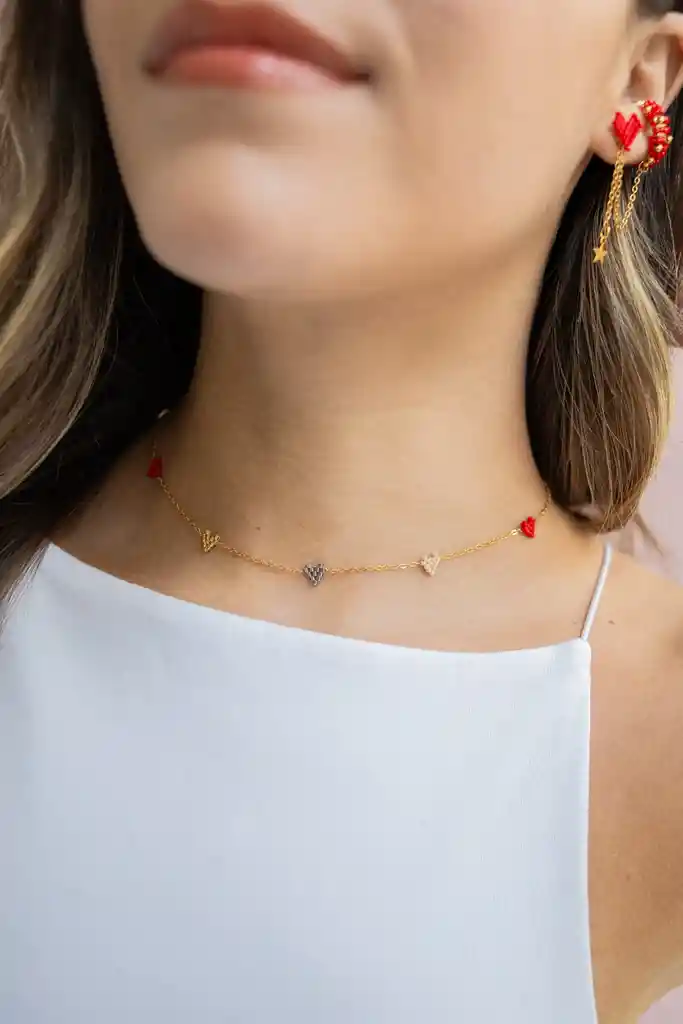 Cadena en Acero con baño en oro de 24k con corazones elaborados en Miyuki. Incluye: 1 cadena corazones de colores. Incluye aretes tipo topos (aretes pequeños), el diseño del arete llegará según disponibilidad. Recibe con tu compra una FLORIBAG gratis, para que guardes por separado tus accesorios. Hecho a mano en Colombia. *Ten presente que algunas de las imágenes pueden estar ambientadas con otros productos que se venden por separado.