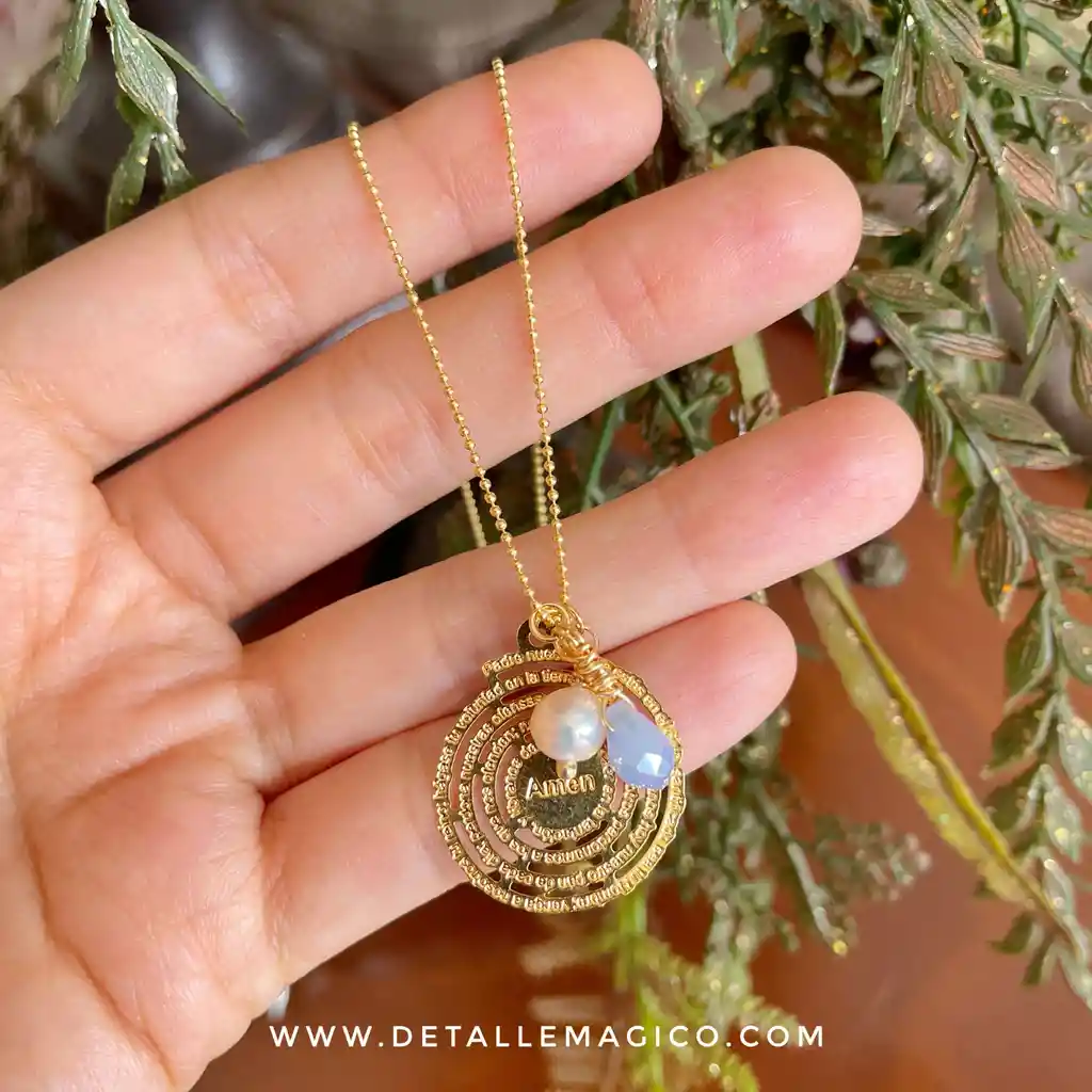 Cadena Padre Nuestro, contiene el grabado de la oración del padre nuestro. Un hermoso detalle para lucir o regalar. Dije en acero grabado con la oración, acompañada con cristales facetados y perla. Cadena en oro golfi.