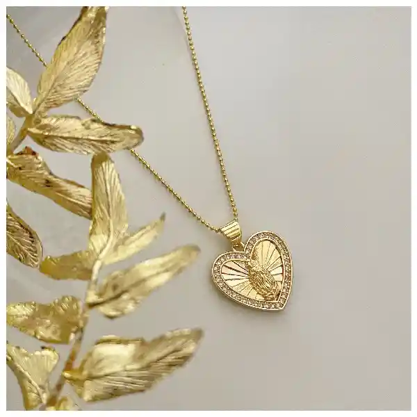 Cadena con dije en forma de corazón con grabado de la virgen y cristales de microcircones en el marco. Cadena en oro golfi. Un detalle perfecto para lucir o regalar a una persona especial!