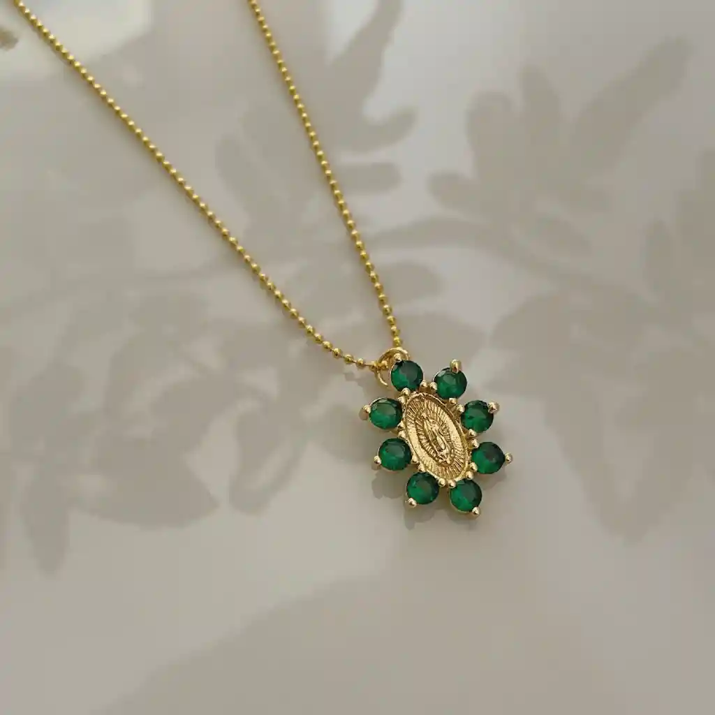 Cadena con dije en forma de flor, grabado de la virgen y Cristales de micro circón verde que simulan pétalos. Cadena en oro golfi.
