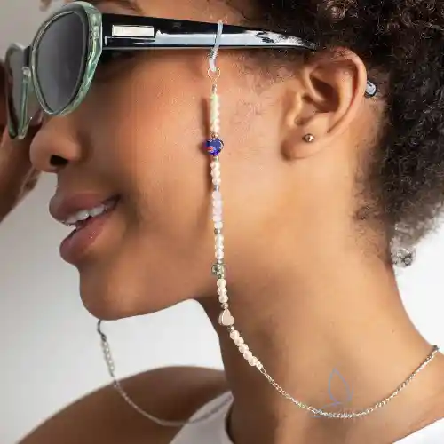 Complemento para tus gafas, hecha a mano con perlas de vidrio, murano, murrinas y acerina plateada.