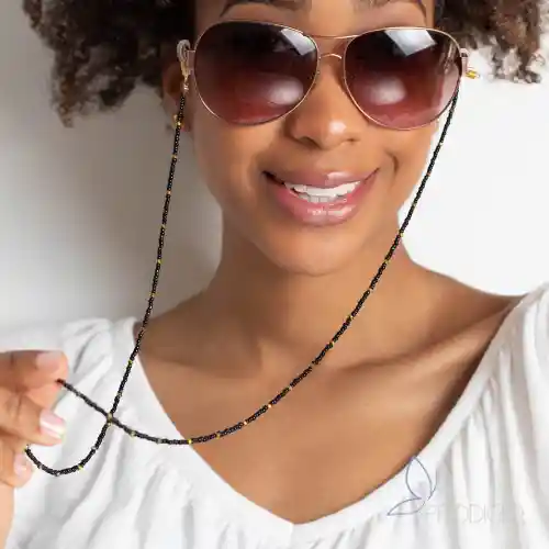 Complemento para tus gafas, hecha a mano con base en chaquiras checas negras y doradas.