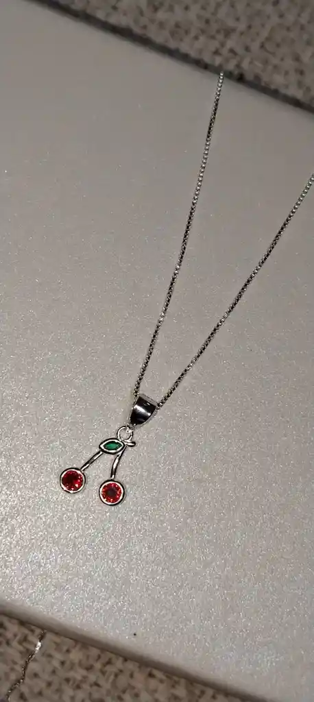 CADENA Y DIJE DE CEREZAS PLATA 925, PUEDE ESCOGER LA CADENA EL LARGO DE 40 CMS Ó 50CMS La plata 925 ofrece beneficios como durabilidad, resistencia y un brillo atractivo, ideal para joyería de uso diario. Es hipoalergénica, lo que la hace segura para pieles sensibles. Además, su versatilidad permite una gran variedad de diseños y su mantenimiento es relativamente fácil.