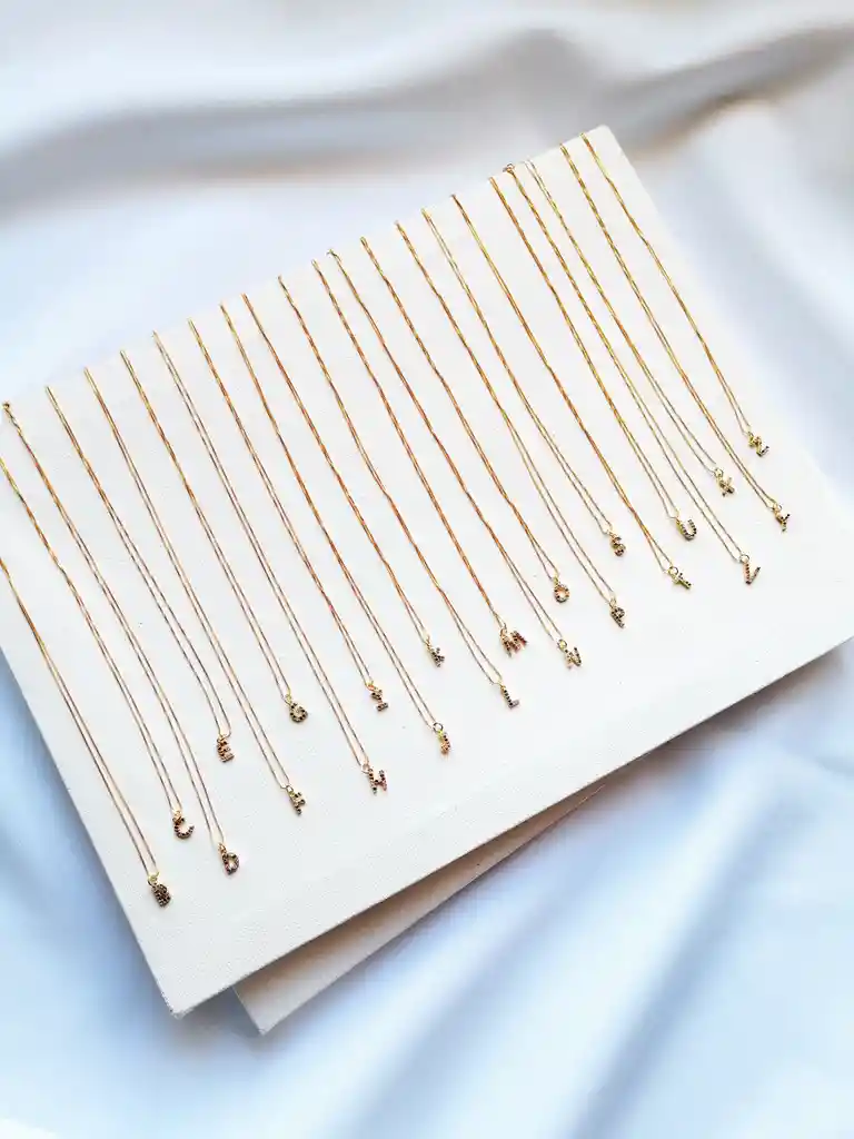 Cadenita de 40 cm con mini dije en rodio de 0,7 cmLetras: A, B, C, D, E, F, G, H, I, J, K, L, M, O, P, R, T, U, V, X, Y, Z