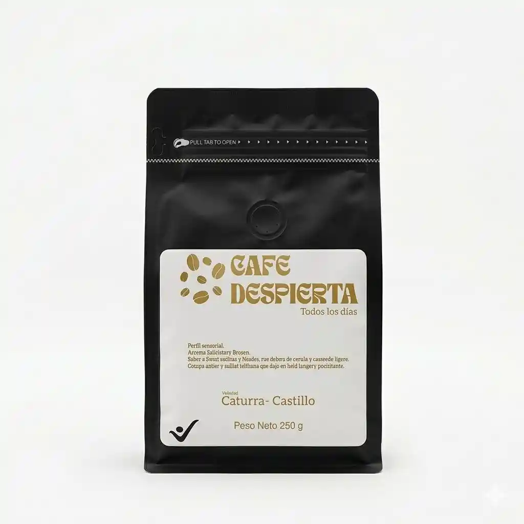 Cafe de especialidad caturra, 100 % cafe, garantizamos que este cafe es puro, Peso neto 250 gramos, Aroma dulce, cuerpo medio, tostion media, acidez media, por cada 100 ml- 1 de agua, utilizar entre 6g a 9g de cafe.