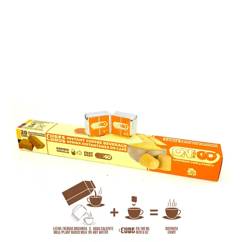 Casacafé te Trae on The Go Bebidas Instantáneas de Café Para Preparar en 1 Minuto. No Necesita Máquina Para su Preparación. On The Go Campesino Viene Con 20 Cubos. Modo de Preparación: Calentar 180mL (6 Oz) de Agua Leche U Otra Bebida Orgánica (Leche de Coco Soya Almendras Etc) Echar 1 Cubo de on The Go Mezclar Bien Durante 1 Minuto o Hasta Que Se Disuelva Completamente. Opcional Utilizar Espumadora Para Darle un Toque de Espuma Extra A tu Bebida. Contiene Panela No Necesitas Otros Endulzantes. Conoce Los Otros Sabores on The Go Caja Con 20 Und