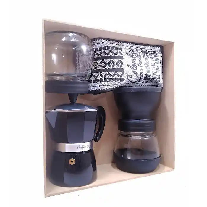 Con el kit de eperiencia de café moka y molino disfrutarás al máximo las cualidades del café. Incluye café Colombia is Tradition 250g tueste fuerte grano, molino de café manual, cafetera moka 3 tazas y estuche en madera.