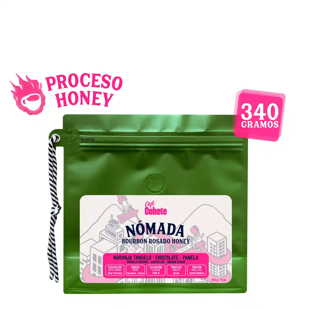 Nuestro café especial de temporada Bourbon Rosado Honey (Nómada) tiene deliciosas notas a naranja tangelo, chocolate y panela. DESCRIPCIÓN DEL CAFÉ NÓMADA Caficultor: Eivar Montaño. Origen: Piendamó, Cauca. Variedad: Bourbon Rosado. Proceso: Honey. Altitud: 1.800 M.S.N.M. Perfil de taza: Naranja tangelo, chocolate y panela. Cuerpo: Medio sedoso. Acidez: Málica (Fruta madura). Tostión: Media. Notificación sanitaria: NSA-0013394-2023.