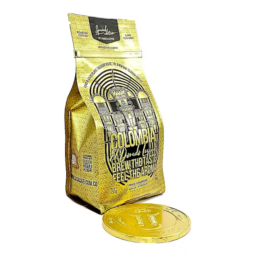 Variedad: Castillo Origen: Amagá Antioquia Altura: 1. 450 M Puntaje de Taza: 856Tueste: Alto Historia de el Dorado (Museo Del Oro Bogotá) Una Increíble Búsqueda en el Pasado Que Se Convirtió en Leyenda Porque Jamás Fue Hallado. en su Interior Encontrarás el Dulce Tesoro un Medallón Gigante de Chocolate Ideal Para Acompañar tu Café. Disponible en 250G (88 Oz) y 125G (44 Oz). El Café Leyenda el Dorado Viene en un Tueste Alto el Preferido Por la Mayoría de Nuestros Clientes Que No Pierde Del Todo la Acidez Característica de Los Cafés Colombianos E Introduce un Sabor Más Dulce Producto Del Mayor Tiempo de Tostión y No Llega A Ser Tan Fuerte Como un Espresso.