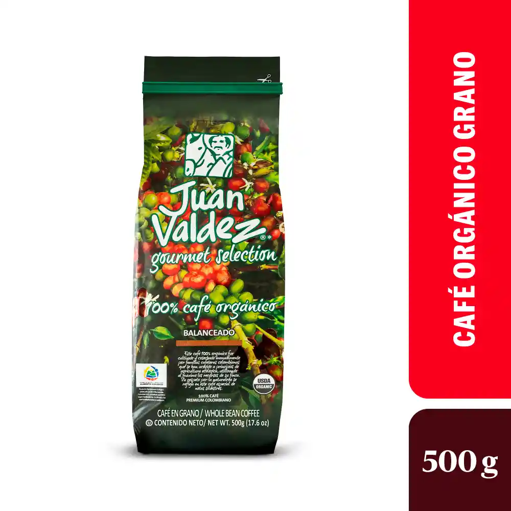 Café Premium 100% Colombiano Excelso. Nuestro Café Orgánico 100% Juan Valdez Gourmet Selection 100% es cultivado y seleccionado por familias cafeteras colombianas que adoptan los principios de la agricultura sostenible para proteger sus tierras y sus recursos naturales. ¡El café orgánico Juan Valdez nos enorgullece! Aporta muchos benéficios, como el apoyo a los caficultores de Colombia, uso de recursos renovables, la limitación de uso de plantas y animales genéticamente modificados y la transparencia en el etiquetado. Otro gran beneficio es que, al ser natural, está libre químicos y fertilizantes llevándolo a ser la mejor opción de un café natural, fresco y delicioso, lo que lo hace el mejor café orgánico de Colombia y del mundo. Contamos con los siguientes certificados: xAlimento Ecológico (Mercado Colombiano) USDA (Mercado Americano) UE (Mercado de la Comunidad Europea) JAS (Mercado Japonés) Café Orgánico balanceado con carácter y notas silvestres de sabor a Té de moringa y nuez tostada. *Notas de sabor: Es una característica o sensación de sabor al tomar una bebida.