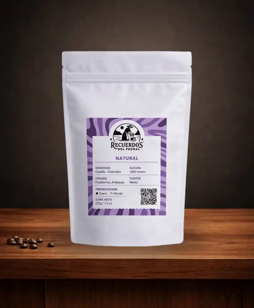Café de especialidad, variedad Castillo - Colombia de proceso natural y puntaje 83 SCA. Mantiene las características naturales del fruto, ofreciendo un perfil intenso y balanceado con notas afrutadas. Perfecto para aquellos que desean un café poco convencional. Origen: Pueblorrico, Antioquia. Altura: 1850 msnm.