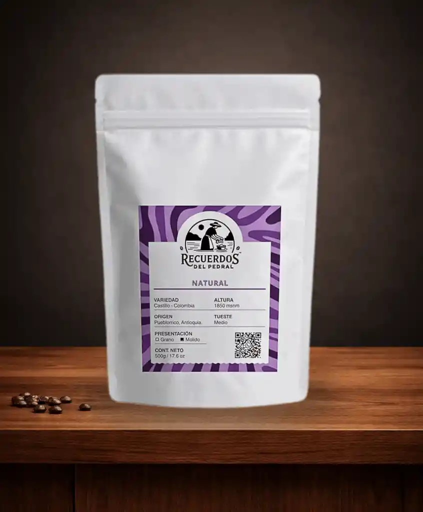 Café de especialidad, variedad Castillo - Colombia de proceso natural y puntaje 83 SCA. Mantiene las características naturales del fruto, ofreciendo un perfil intenso y balanceado con notas afrutadas. Perfecto para aquellos que desean un café poco convencional. Origen: Pueblorrico, Antioquia. Altura: 1850 msnm.