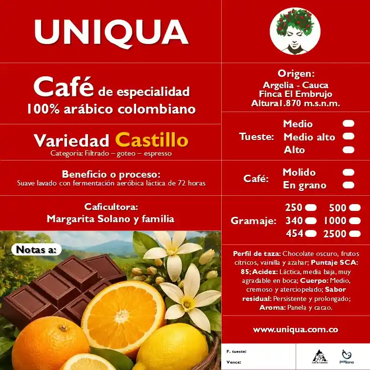 Café arábico 100% colombiano, variedad: Castillo, tueste medio, en grano, 340 gramos beneficio o proceso: suave lavado fermentación aeróbica por 72 horas origen: Argelia - Cauca, altitud: 1.870 m.s.n.m., Caficultora: Margarita Solano. Descripción del perfil en taza: Chocolate oscuro, frutos cítricos, vainilla y azahar Acidez: Láctica, media baja, muy agradable en boca Cuerpo: Medio, cremoso y aterciopelado Sabor residual: Persistente y prolongado Aroma: Panela y cacao. Café producido 100% por mujeres. Somos café de Colombia y PaisSana: Café de territorios de paz. Puntaje SCA: 85