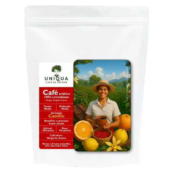 Café arábico 100% colombiano, variedad: Castillo, tueste medio, molido en media, 340 gramos; beneficio o proceso: suave lavado; fermentación aeróbica por 72 horas; origen: Argelia - Cauca, altitud: 1.870 m.s.n.m., Caficultora: Margarita Solano. Descripción del perfil en taza: Chocolate oscuro, frutos amarillos, panela y vainilla; Acidez: Láctica, media, muy agradable en boca; Cuerpo: Medio, complejo y cremoso; Sabor residual: Persistente y prolongado; Aroma: Panela y cacao. Café producido 100% por mujeres. Somos café de Colombia y PaisSana: Café de territorios de paz. Puntaje SCA: 85.5