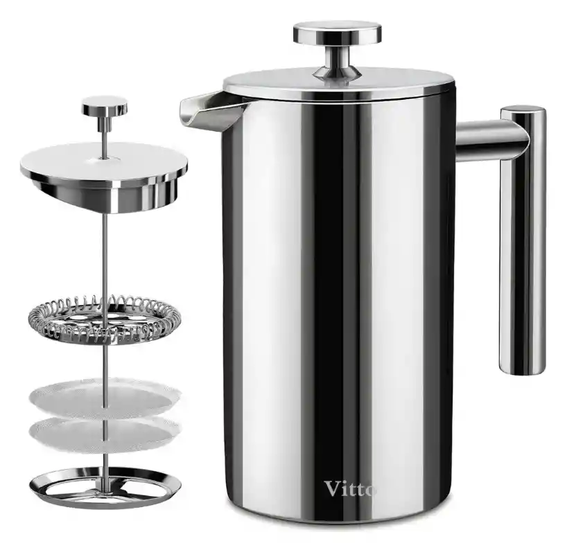 Prensa Francesa en Acero Inoxidable | 800ml Diseño moderno y ergonómico en acero inoxidable de alta calidad. Cuenta con una franja de vacío interior (double wall) que permite conservar el calor por mucho mas tiempo y evita que la parte exterior se caliente en exceso. Fabricada en acero inoxidable de grado alimenticio (SS 304 18/10) con acabados de alta calidad ideal para complementar cualquier cocina o sala. Este modelo es mucho más robusto y resistente que los anteriores. Perfecta para la preparación casera o profesional de café, té o infusiones. Características: Material: Acero Inoxidable Capacidad: 800ML Dimensiones: Marca: Vitto & Fiore Garantía del vendedor: 30 días