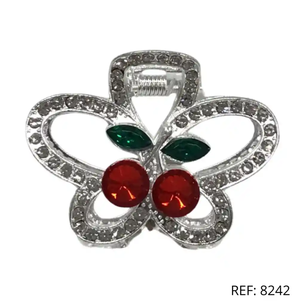 Prendedor mariposa plateada con pedrería y cerezas rojas, diseño elegante y sofisticado.
