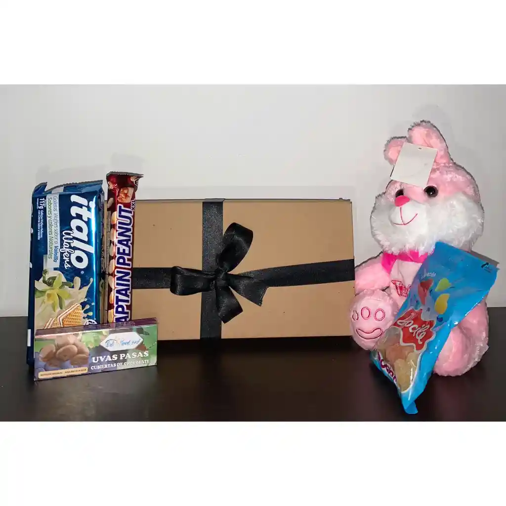 Caja decorada con moño en cinta decorativa, contiene un peluche y variedad de dulces.