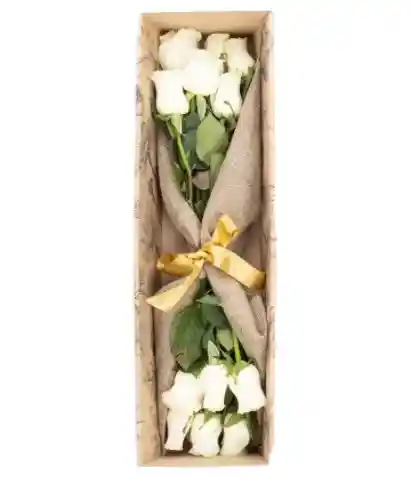 Caja Contiene 12 Rosas Blancas. Decorada con Follaje, Papel y Moño
