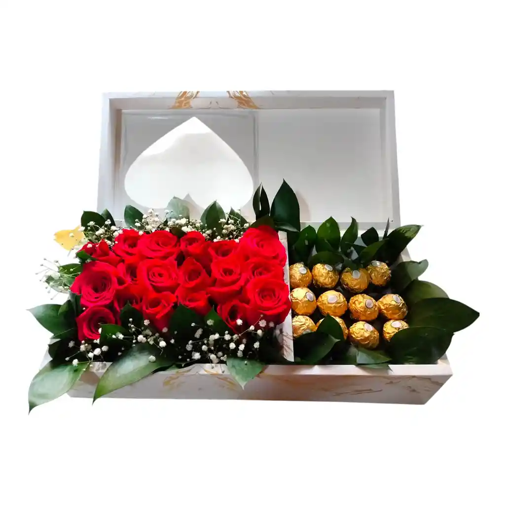 Caja 18 rosas 12 chocolates ferrero Rocher.
