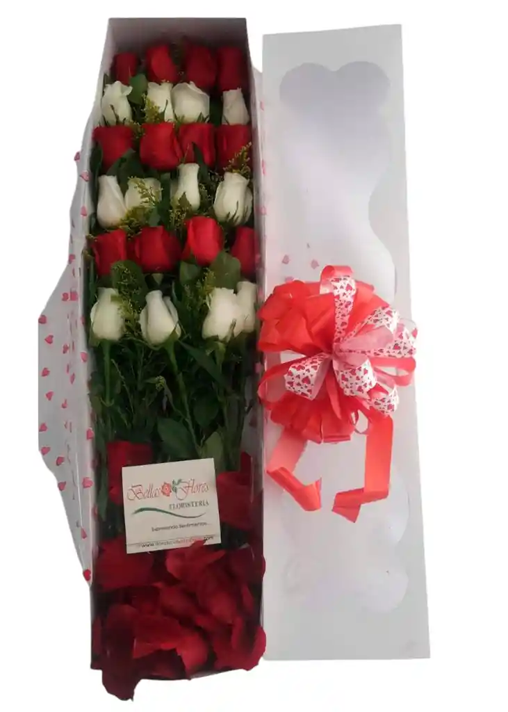 Caja Contiene 18 Rosas Blancas y rojas. Decorada con Follaje, Papel y Moño