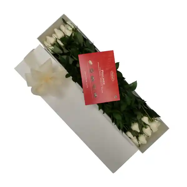Caja Contiene: Rosas Blancas Seleccionadas Empacadas en Una Fina Caja de Cartón Duro y Reciclable 24 Unidades + Chocolates Pralinés Importados 180 g + Follaje 1 Und + Alimento Para Flores 1 Und + Moño Decorativo 1 Und + Tarjeta 1 Und. Personaliza el Mensaje de la Tarjeta en Los Comentarios.. Prohíbase el expendio de bebidas embriagantes a menores de edad. Ley 124 1994.. El exceso de alcohol es perjudicial para la salud. Ley 30 de 1986.