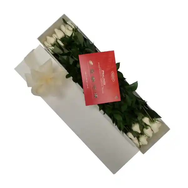 Caja Contiene: Rosas Blancas Seleccionadas Empacadas en Una Fina Caja de Cartón Duro y Reciclable 24 Unidades + Chocolates Pralinés Importados 180 g + Follaje 1 Und + Alimento Para Flores 1 Und + Moño Decorativo 1 Und + Tarjeta 1 Und. Personaliza el Mensaje de la Tarjeta en Los Comentarios.