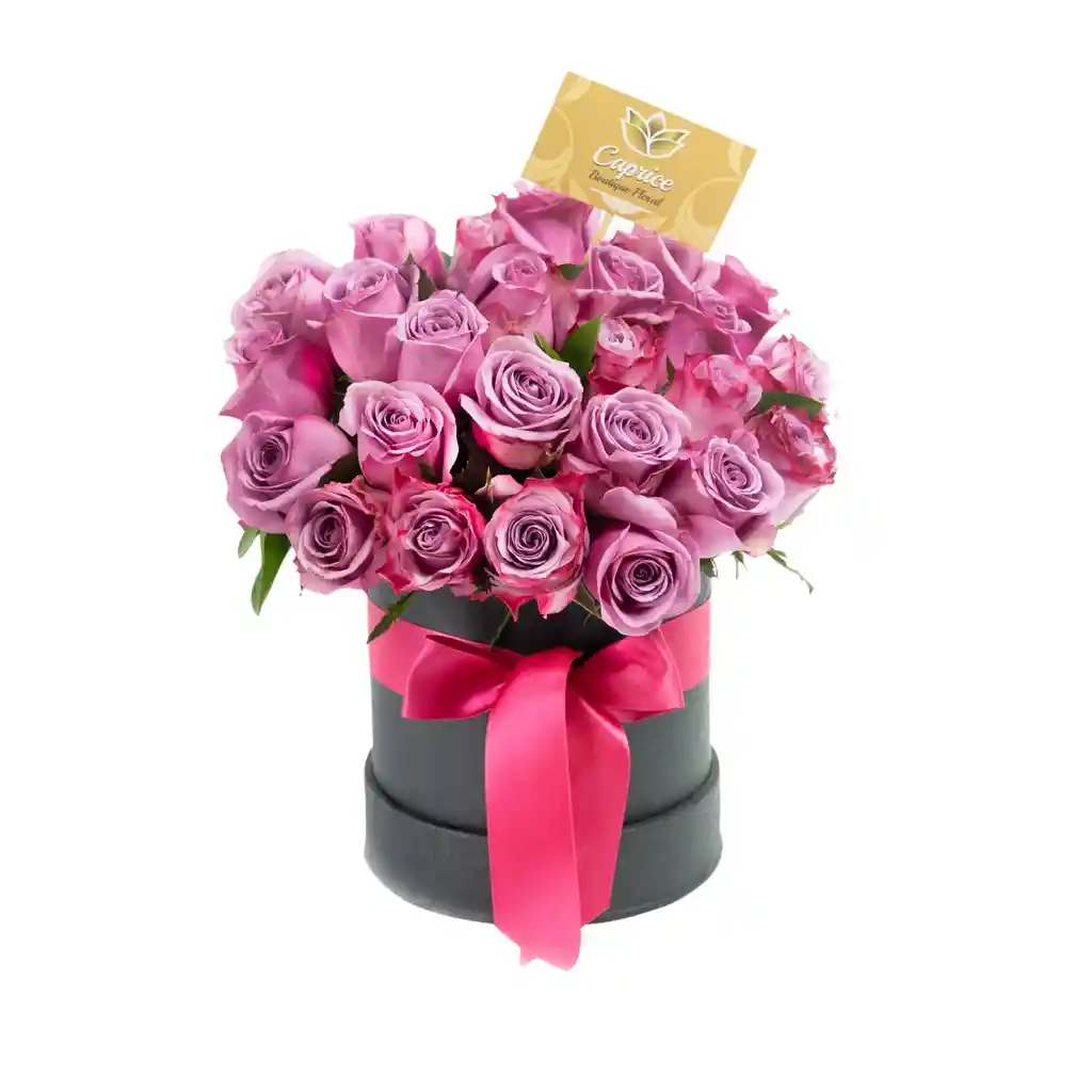 Caja cilíndrica mediana Premium con 24 lila de exportación. Incluye tarjeta dedicatoria. cinta y tarjeta de cuidado. En caso de querer un mensaje con el arreglo por favor escribirlo en comentarios.