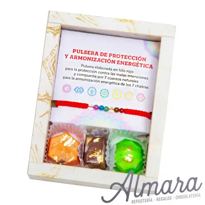 Caja con pulsera 7 chakras 3 bombones de chocolate rellenos 1 Pulsera elaborada en hilo rojo (el hilo rojo se considera sagrado y se utiliza en muchas celebraciones y tradiciones religiosas. Para que la gente se sienta conectada, la pulsera roja se llevaba como símbolo de buena suerte y protección) compuesta de 7 piedras naturales para la armonización y energización de los 7 chakras. Almara Anchetas chocolates caja rellenos,desayunos, perdón, sorpresas