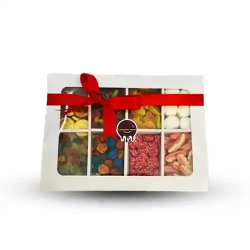 Contiene: - Caja de 8 divisiones - Mix de 8 diferentes tipos de gomas