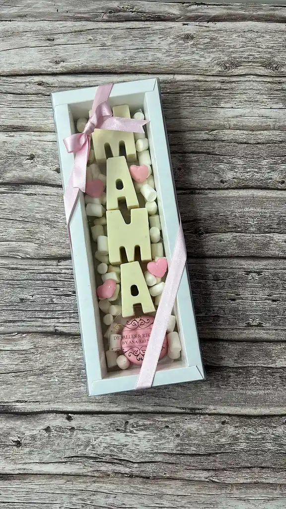 Caja de acetato con chocolate relleno de letras MAMÁ, rosa de chocolate, masmelos y chocolatinas. Especial Día de las Madres.