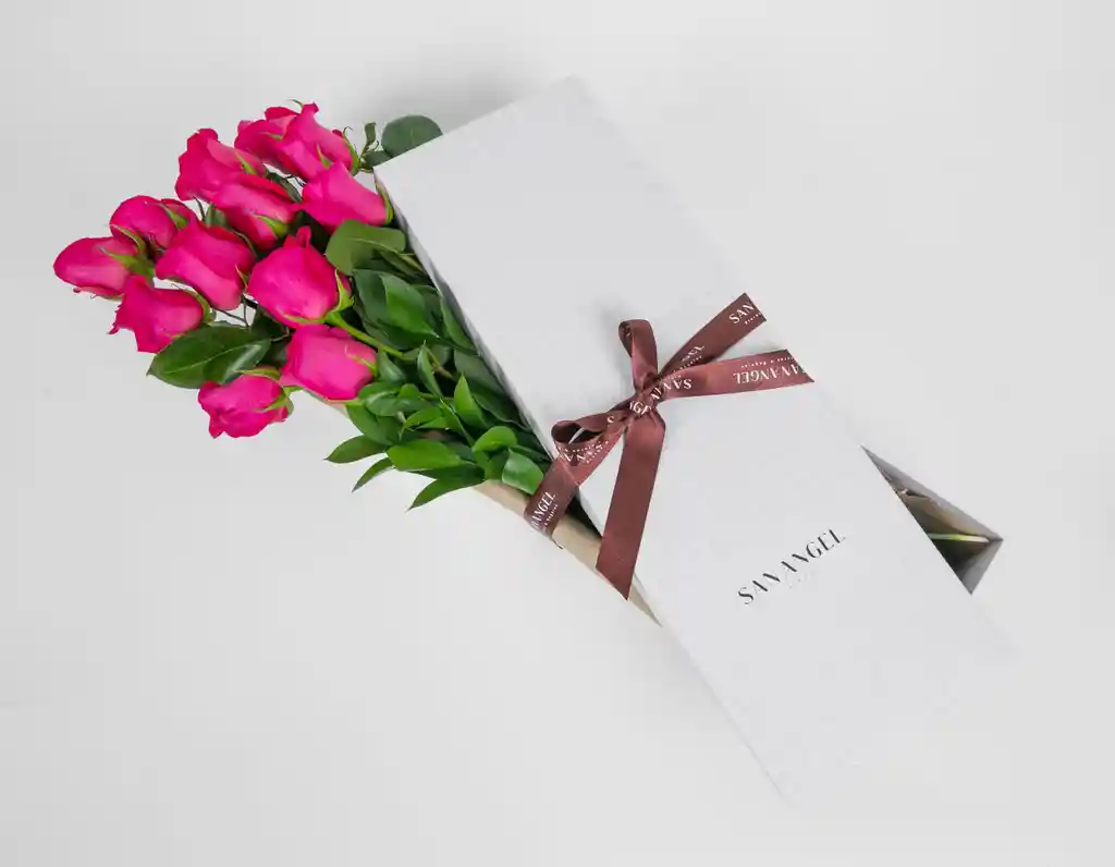 Caja Agata de San Angel con 12 rosas premium color fucsia