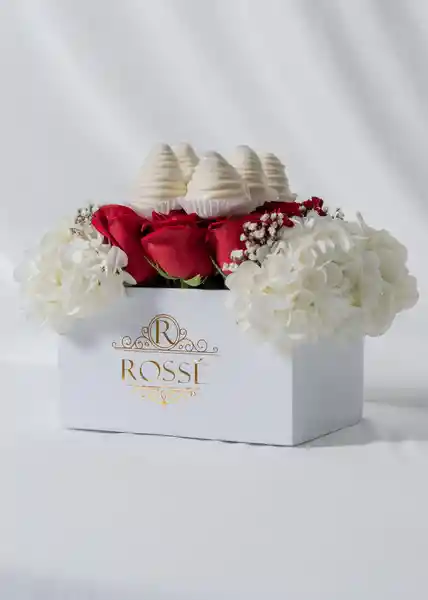 Nuestra Ref. Caja Amatista: Elaborada Con 12 Rosas Naturales y Hortensias (Opcional) Más 6 Fresas Cubiertas de Chocolate (Blanco/Negro/Rosado/Azul/Amarillo) y Toppings (Maní/Coco/Chispas de Chocolate/Perlas Plateadas). Este Producto Va Envuelto En Tull Blanco Con Lazo y Tarjeta.