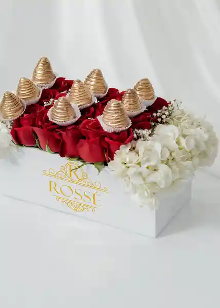 Nuestra Ref. Caja Ámbar: Elaborada Con 18 Rosas Naturales y Hortensias (Opcional) Más 9 Fresas Cubiertas de Chocolate (Blanco/Negro/Rosado/Azul/Amarillo) y Toppings (Maní/Coco/Chispas de Chocolate/Perlas Plateadas). Este Producto Va Envuelto En Tull Blanco Con Lazo y Tarjeta.