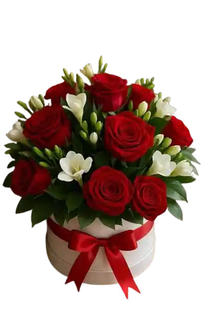 Caja redonda con rosas rojas y delicadas flores blancas, diseñada para expresar amor, elegancia y armonía. Un regalo sofisticado para cualquier ocasión especial.