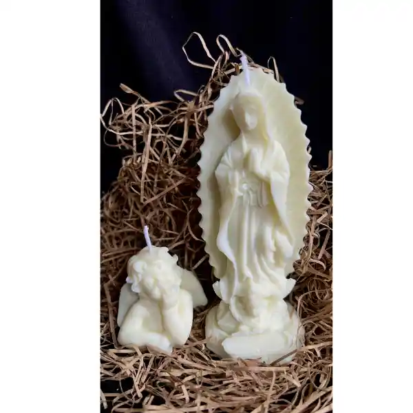 Set de velas aromatizadas con diseños de la Virgen de Guadalupe y un Ángel. Su detallado acabado las convierte en piezas ideales para momentos de oración, meditación o como una decoración especial en cualquier espacio. Se envía en caja.