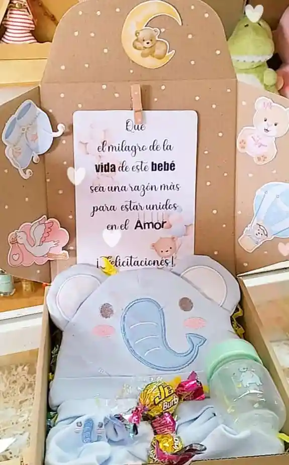 Caja Anuncio Embarazo 👣🍼🩵🩷 🛑 Bajo Pedido 24 Horas De Anticipación Contiene: Dos burbujet, tetero pequeño, gorrito y zapaticos de color azul con diseño de elefante.