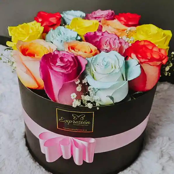 Caja de cartón con forma de cilindro que contiene 15 a 18 Rosas de Colores, adornadas con follaje. *Color de las flores está sujeto a disponibilidad