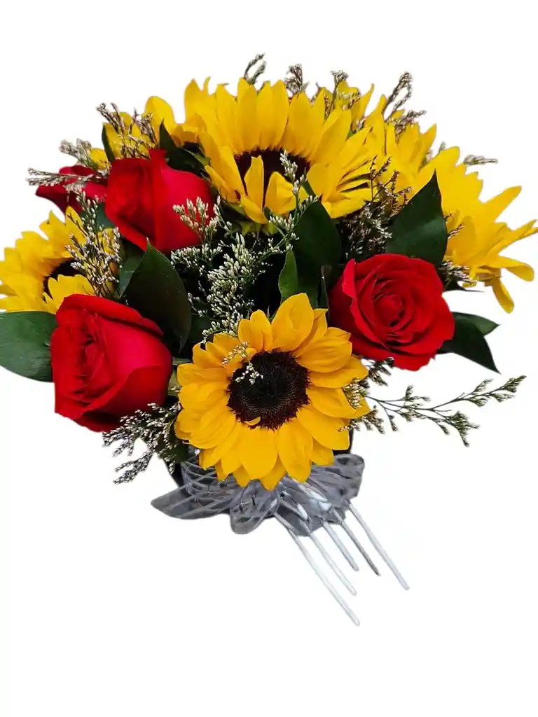 Arreglo en caja redonda con 5 girasoles, 6 rosas y follaje