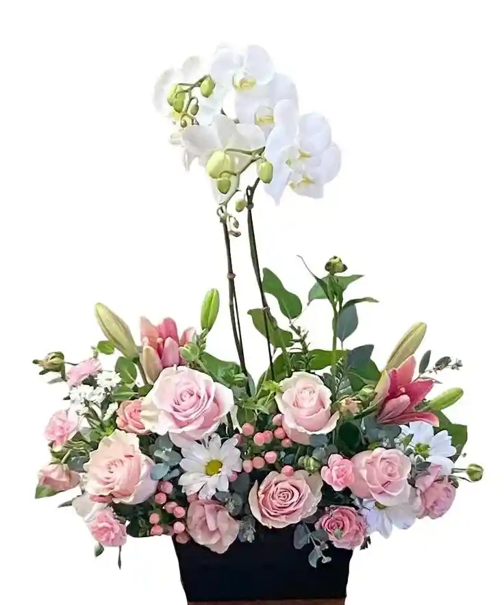 Caja con aprox. 3 varas de lirios rosados ,12 rosas rosadas , medio paquete de margarita blanca , 1 orquidea con eucalipto , rusco y hiperico rosado . Nota: La flor puede ser sustituida dependiendo la disponibilidad de color y del producto “Mensaje Personalizado” máximo de 30 caracteres (Dejar el mensaje en el chat, los comentarios no se previsualizan para la tienda por lo que si se dejan allí no podrá ser incluido).
