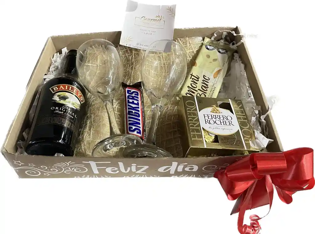 Deliciosa Caja decorativa que contiene Baileys 375ml, 2 copas de vidrio, caja ferrero x4, chocalatina Mont blanc y Snickers