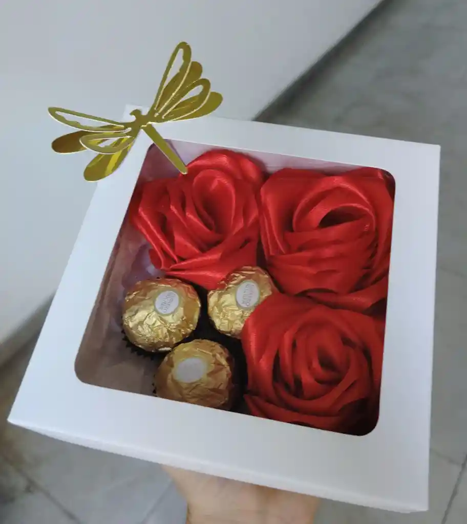 Caja blanca con ventana, con bombones de chocolate y rosas rojas preservadas