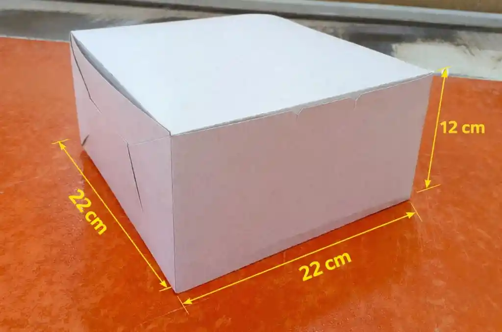 Caja cuadrada para tortas de fácil armado, color blanco. Ideal para el empaque de tortas y todo tipo de productos. Fabricada en cartulina resistente. Apta para el contacto con alimentos. Medidas: 22 ancho × 22 largo × 12 alto.
