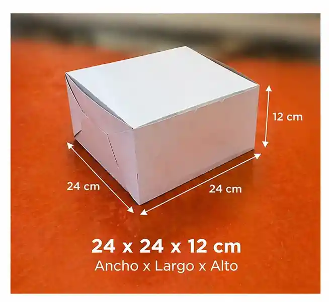 Caja cuadrada para tortas de fácil armado, color blanco. Ideal para el empaque de tortas y todo tipo de productos. Fabricada en cartulina resistente. Apta para el contacto con alimentos. Medidas: 24 de ancho × 24 largo × 12 alto.