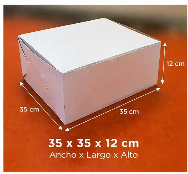 Caja cuadrada para tortas de fácil armado, color blanco. Ideal para el empaque de tortas y todo tipo de productos. Fabricada en cartulina resistente. Apta para el contacto con alimentos. Medidas: 35 ancho × 35 largo × 12 alto.